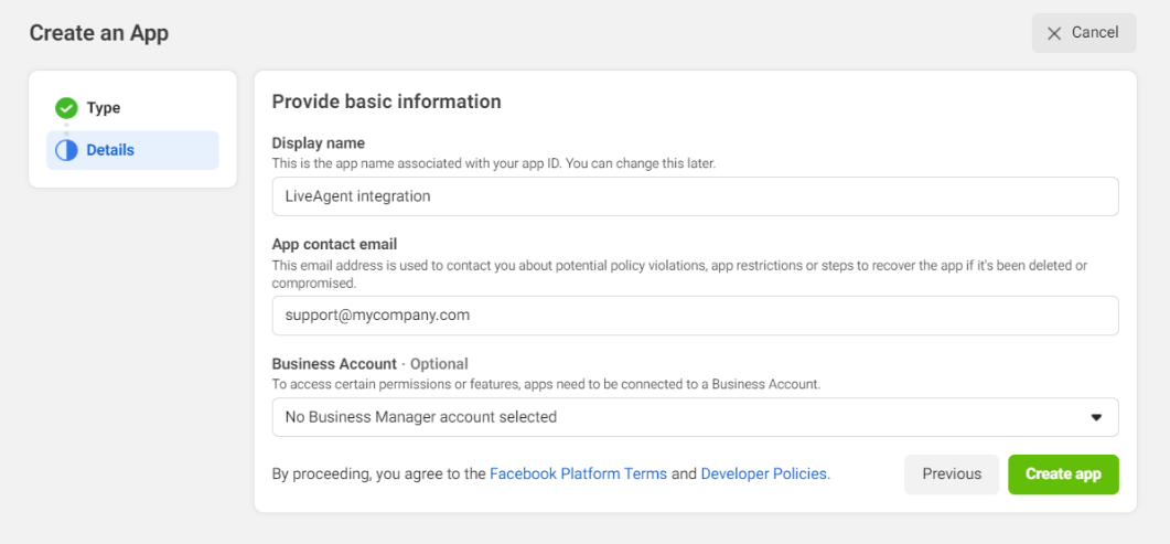 In the Facebook developer panel, click on "Create App". In the app creating screen choose the"Business" type, click on "Adjacent", fill in the"Display proper name" and"App contact electronic mail" fields, and click on"Create app". You will exist asked to submit your Facebook password to terminate the procedure.