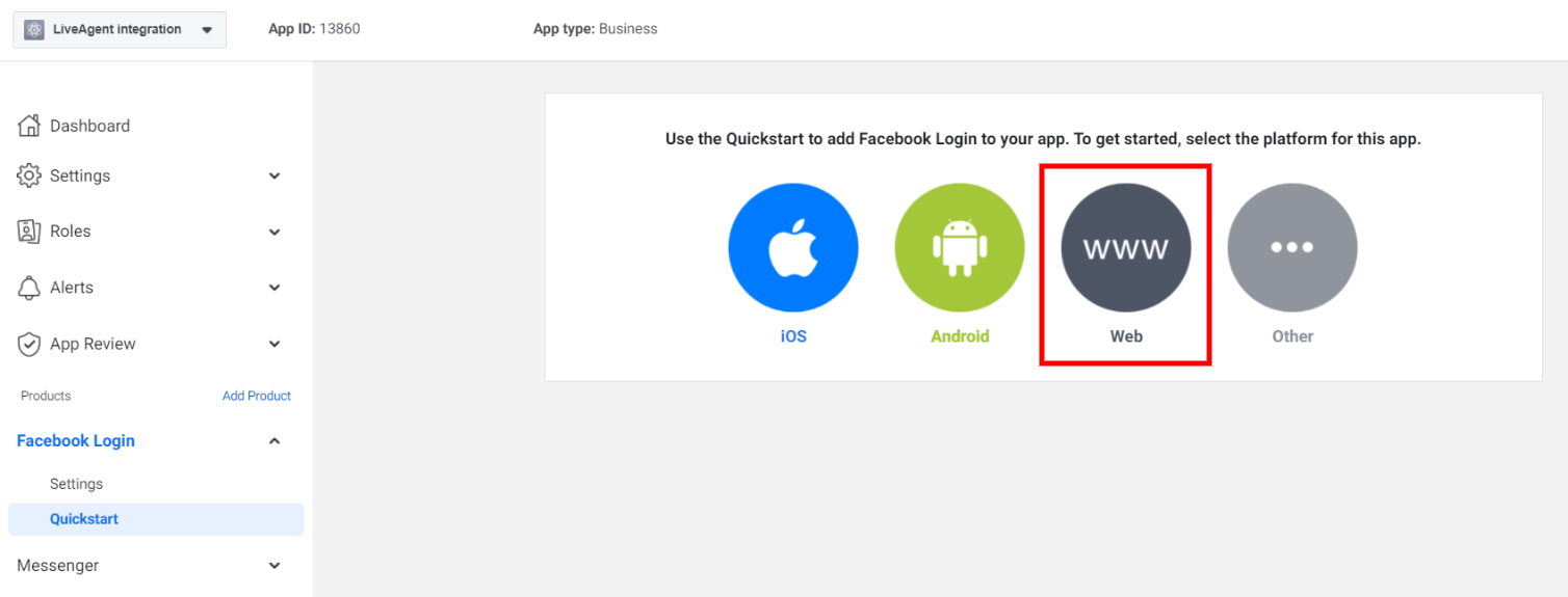 In the Facebook Login product Quickstart, choose the "Spider web" type of the platform, then insert the URL of the site where your LiveAgent account is installed into the"Site URL" field, and hit "Salve". No other actions in this department are required.