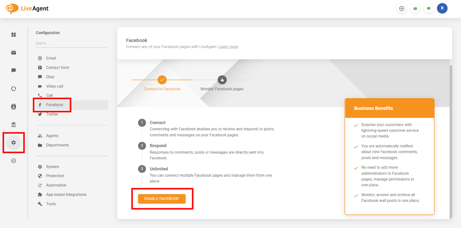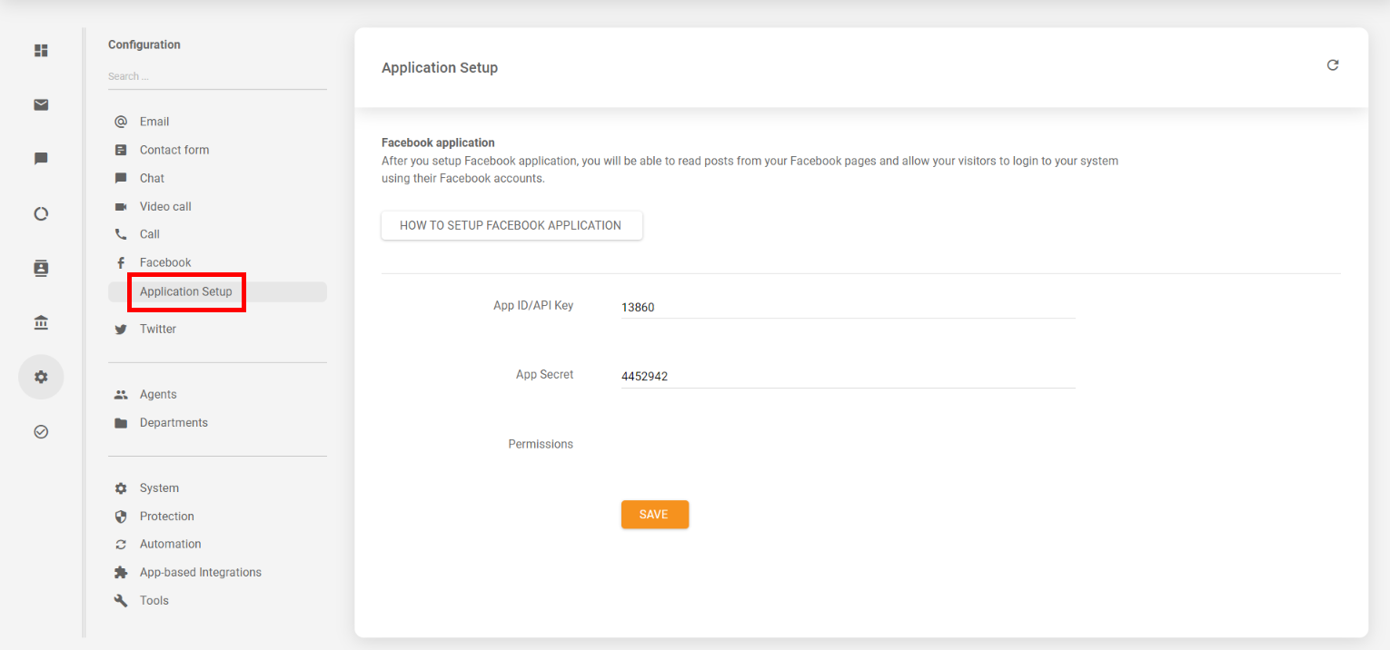 In your LiveAgent panel, navigate to "Configuration > Facebook" and click on" Enable Facebook". Your LiveAgent panel refreshes, and a new sub-tab"Application Setup" will announced nether"Configuration > Facebook".